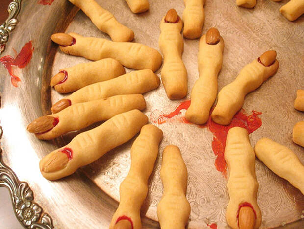 Кровавые пальцы ведьмы являются одним из самых впечатляющих десертов на Хэллоуин. Вначале они могут показаться страшными, но стоит только попробовать – за уши не оттянешь. Под страшным видом скрывается вкусное и питательное миндальное печенье. Эти кровавые пальцы обязательно должны быть в каждом меню на Хэллоуин!