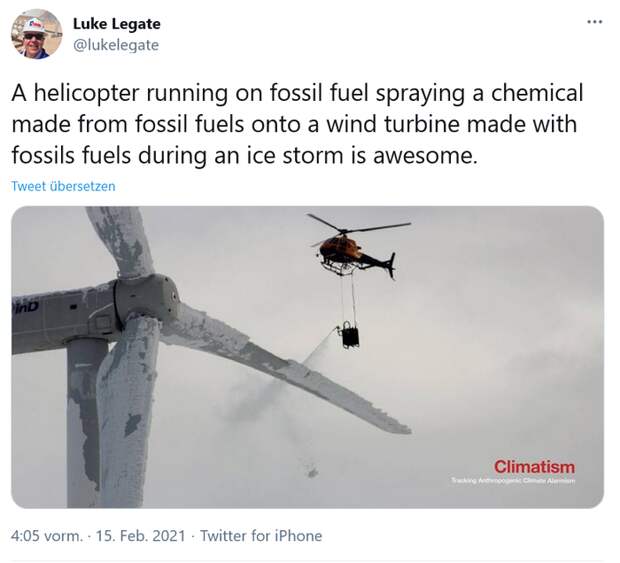 Теперь ветряки приходится обрабатывать антиобледенителями с вертолётов, с колоссальными затратами топлива и выбросами углекислого газа в атмосферу. Вот такая она - “чистая энергетика”, как обычно вовсе не про чистоту, а лишь про освоение “зелёных грантов”.