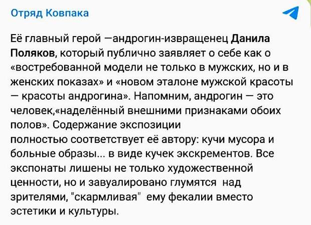 Телеграм-канал «Отряд Ковпака» посвятил этому событию целую публикация, дав ей название «Фекальные грезы извращенцев-андрогинов вместо выставок про героев СВО». А восторженная рецензия быстро всё расставила по местам.