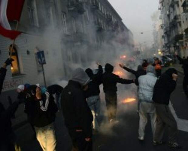 Мы осуждаем нарушение Венской конвенции".Демонстрация была приурочена ко Дню независимости Польши. Сначала ее участники - члены националистических организаций и футбольные фанаты - шли с плакатами, направленными против мигрантов. Затем молодые люди в масках стали поджигать строительные сетки на домах и бросать петарды в полицейских.