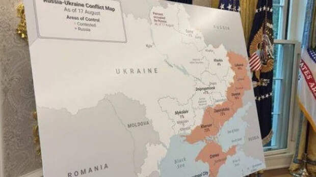 И вот уже на встрече с Зеленским Трамп вывесил эту самую карту, с "российскими землями", который Зеленский попросил забрать с собой: