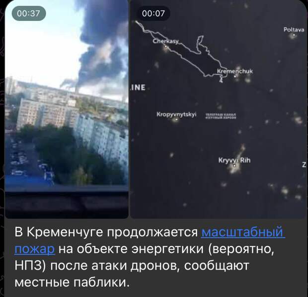 "Масштабный пожар на Кременчугском НПЗ до сих пор не удаётся потушить, а дым виден из космоса и дошёл уже до Кривого Рога, откуда ветер его несёт на Херсон", - жалуются украинские СМИ.