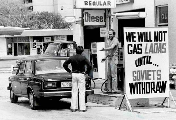 1984 год, член НАТО Канада, г. Торонто, владелец автозаправки отказывает в бензине владельцу автомобиля Lada модели 2106 (да, было такое, наши Жигули поставлялись по всему миру, сам видел их и в Европе, и в Африке, и в Латинской Америке). Отказывает гражданину Канады, между прочим, причём делает это явно, подстраиваясь под пропаганду: