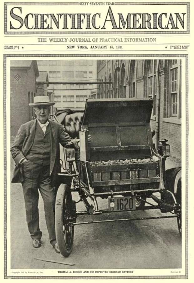 1911 год, Томас Эдисон со своим электроавтомобилем «Edison Baker» держит в руках одну из батарей: