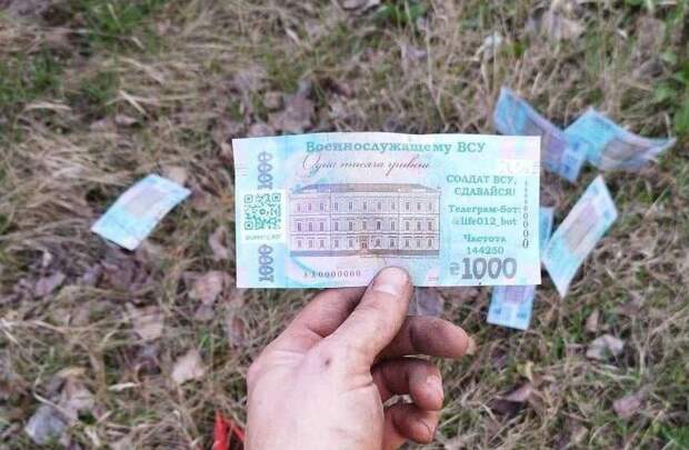 Листовки с призывом сдаться в виде украинской гривны сбрасывается на позиции украинских боевиков на запорожском направлении, на них указана радиочастота, по которой можно выйти на связь с представителями РФ, рассказал представитель спецслужб.