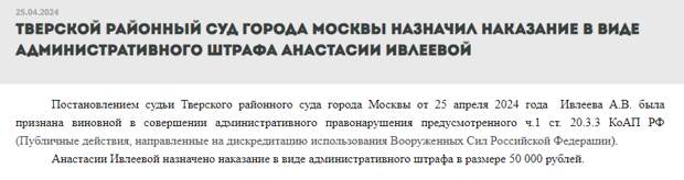Здравствуй, дорогая Русская Цивилизация. Вчера стало известно, что Ивлеева оштрафована на 50 тысяч за дискредитацию ВС РФ. Тверской суд Москвы признал её виновной по статье 20.3.3 КоАП РФ.