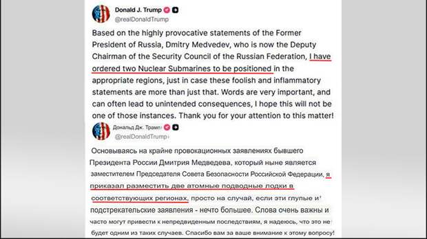 1 августа Трамп в своей соцсети написал, что приказал двум атомным подводным лодкам занять "определённые районы". Скриншот в Truth Social