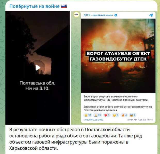 Целями атаки в прошлую ночь стали предприятия ВПК, а также газовые узлы, обеспечивавшие их работу, на Украине. "Нафтогаз" признал атаку одной из самых мощных с начала конфликта, отметив, что часть повреждений не подлежит восстановлению, отмечает life.ru. Особенно пострадала Полтавская область, где сосредоточены ключевые газоперерабатывающие мощности страны.
