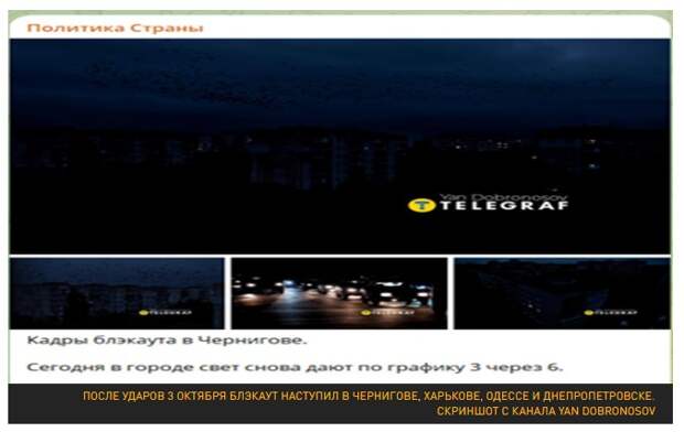А "выключение" Украины тем временем продолжается. После ударов 3 октября блэкаут наступил в Чернигове, Харькове, Одессе и Днепропетровске. Также частично уничтожена и газовая инфраструктура Украины. В ночь на 4 октября Шостка, Сумская область, после атаки осталась без газа, электричества и воды. Ракеты рванули ТЭЦ в Славянске, оставив ключевой участок фронта без электроэнергии. Без света полностью оказался город Ровно, а Краматорская ТЭЦ фактически перестала существовать как объект энергетической инфраструктуры.