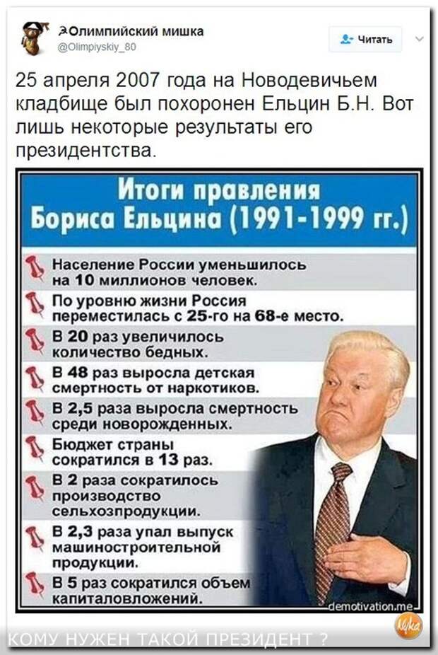 Первый президент Борис Ельцин посвятил жизнь борьбе с коммунистами и их наследием. В 1989 году он одержал тактическую победу, когда ради воплощения своих личных идеалов ускорил развал Советского Союза. Последующие четыре года российский народ терпел на развалинах ушедшей в историю державы тотальную бедность, разгул бандитизма и коррупцию, чтобы достичь обещанных ельцинской «семьёй» райских политических гущ.