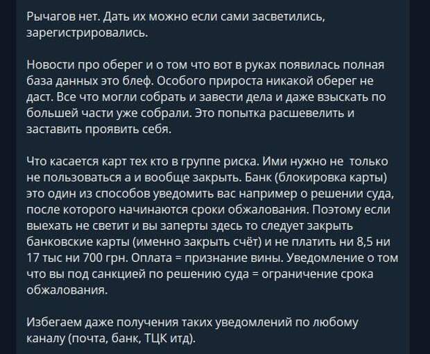 Продолжайте находиться в тени, тарасики, если хотите выжить. Ховайтесь от ТЦК, не пользуйтесь банковскими картами, не ходите на официальную работу, не держите мобильник включённым, лучше вообще не включайте его там, где прячетесь от ТЦК. Лучше всего пользоваться банковскими карточками родственников в возрасте за пределами призывного. А еще лучше — не одной карточкой, чтобы равномерно раскидывать бабло и не светиться со значимыми суммами.