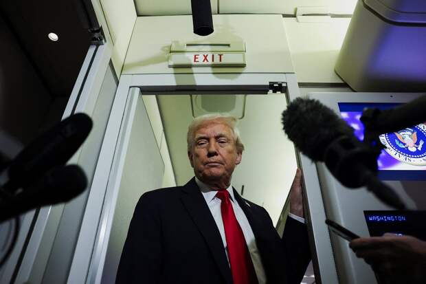 Президент США Дональд Трамп беседует с журналистами на борту Air Force One во время перелета в Палм-Бич, Флорида, 25 ноября 2025 года