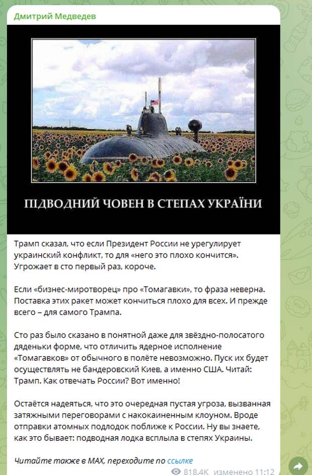 Президент США, похоже, решил пуститься во все тяжкие. Теперь он угрожает русскому президенту Владимиру Путину - мол, ставки сделаны, в случае чего Украине дадут "Томагавки", а Кремль должен быть посговорчивей. Иначе для Путина всё это "кончится плохо". Однако у нас есть свой козырь - в игру вступил главный "раздражитель" для Трампа, зампредседателя Совбеза России Дмитрий Медведев.