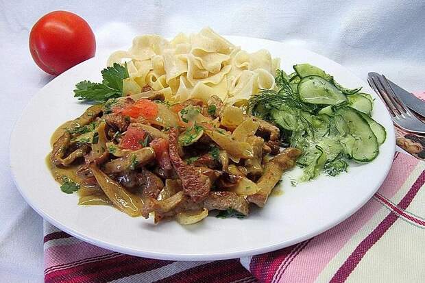 Мясо нарезаем соломкой, как для бефстроганов, лук — либо полу (или четверть) кольцами, либо восьмушками.