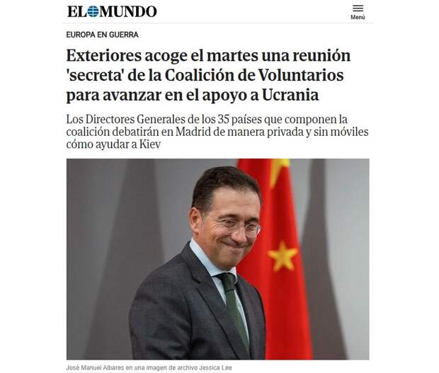 Несмотря на заявленную секретность, испанская газета знает всё – что будут обсуждать на первой сессии (как увеличить поддержку Украины и закрыть её неотложные финансовые потребности, другими словами – где взять деньги) и на второй сессии (там будет попытка выработки общего подхода к гарантиям безопасности для Украины), кто и когда и с какими речами будет выступать.