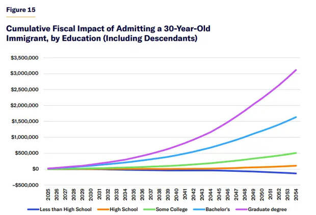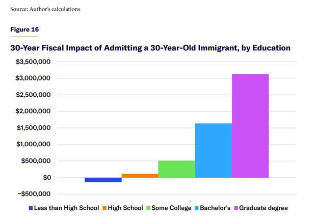 С другой стороны, приём иммигранта того же возраста с высшим образованием принесёт чистую выгоду в размере более 200 000 долларов в течение 10 лет и прибыль в 1,6 миллиона долларов за 30 лет.